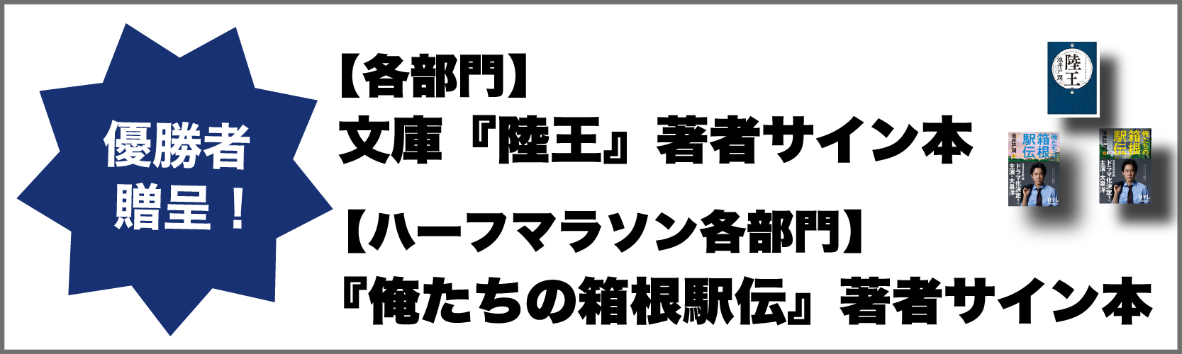 新着情報 一覧へ 2026.03.06 お知らせ各部門の優勝者に文庫「陸王」著者サイン本、ハーフマラソン各部門の優勝者に、「俺たちの箱根駅伝」著者サイン本を贈呈します 2026.01.27 お知らせ【重要】未入金の方へ|お支払い期限(1月31日)のお知らせ 2025.12.05 お知らせ【限定品】40回記念巾着リュックのご案内 2025.10.16 お知らせ「第40回 行田市鉄剣マラソン」の大会チラシを公開中! 2025.10.03 お知らせ「第40回 行田市鉄剣マラソン」の大会情報を掲載しました!